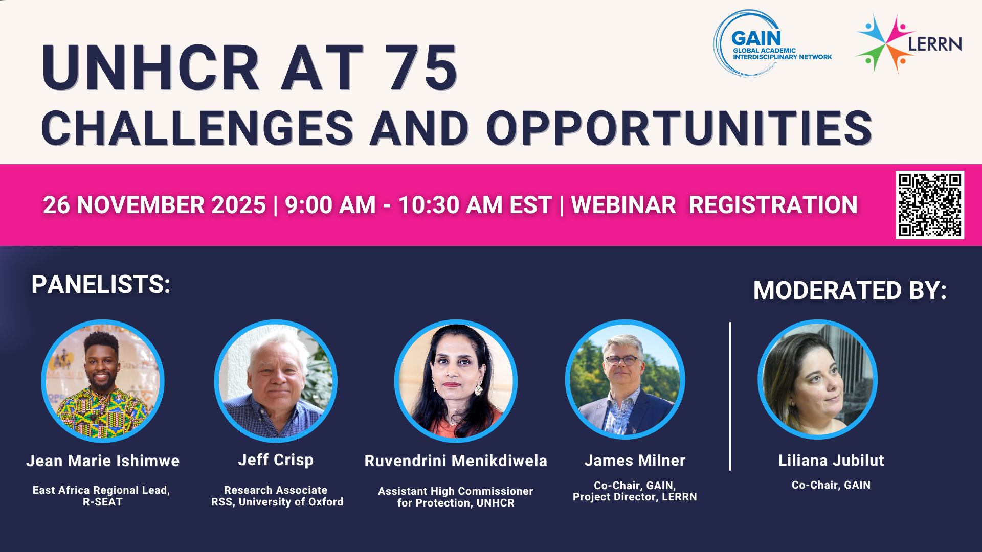 This webinar is co-hosted by the Global Academic Interdisciplinary Network (GAIN) and the Local Engagement Refugee Research Network (LERRN). GAIN was established by Paragraph 43 of the Global Compact on Refugees (GCR) to mobilize the academic research community to help advance the objectives of the GCR. With the support of a Partnership Grant from the Social Sciences and Humanities Research Council of Canada (SSHRC), LERRN is working to ensure that the knowledge and expertise of those most affected by displacement more reliably shapes forced migration studies, policy and practice, contributing to a global forced migration response system that is more effective, legitimate and accountable for and to those most affected by displacement.