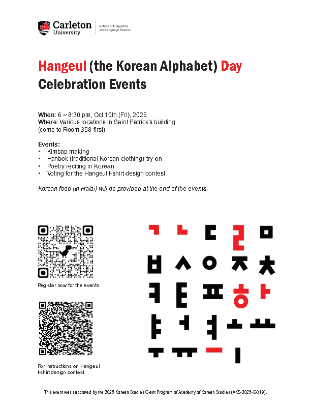 Celebrate Hangeul (the Korean alphabet) Day by unleashing your creativity! The Korean program at the School of Linguistics and Language Studies (SLaLS) at Carleton University invites you to participate in our T-shirt design contest.