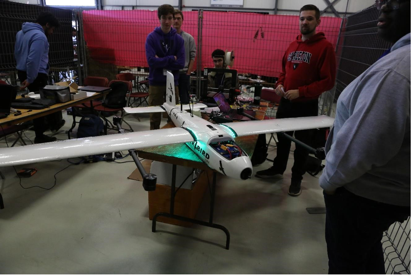 The competition began on the morning of Friday, May 5th with the technical presentations from each team. This year, teams were required to present portions of their presentations in both French and English, which was not an issue for the numerous bilingual members Blackbird brought to the competition. After completing the presentations, the flight-readiness reviews began, but the team started to run into issues. The team was required to demonstrate that the aircraft had a kill switch that would be functional at all times in case the aircraft was to lose communication with the remote pilot and ground station. While the kill switch was functional when the aircraft was in vertical flight, the hybrid configuration of the aircraft posed an issue when in forward flight. The team was given additional time in the afternoon to debug the issue and got some help from another competitor, WARG (Waterloo Aerial Robotics Group) who had a similar aircraft type and had solved the same issue previously. After receiving the all-clear from the judges, the Blackbird UAV Team made their way to the flight line and proceeded to conduct a test flight. While most other teams opted for just hover tests, Blackbird wanted to check the full operation of their systems, so they proceeded to test the transition between hover and forward flight and performed a short flight. It was during this flight that they picked up on a loss of communication in a particular region of the airfield (more on that later). The team piloted the aircraft back to the point of departure and made a successful landing.