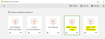 MAE students have access to Carleton’s Virtual Desktop System. These are accessed using your MC1 account. VPN is also required from outside Carleton. In addition to the General Student Lab Image (for all Carleton students) MAE has 2 special images with Engineering Software which uses 3D graphics. Access to these images is based on the course requirements. If you have a MAC computer which cannot run Catia or other software this is an option to use.