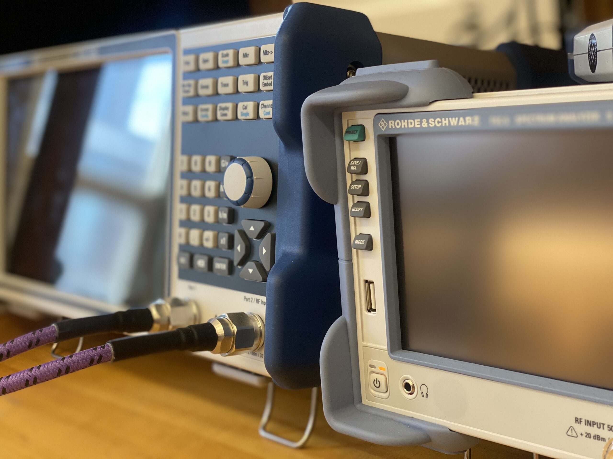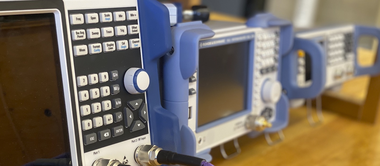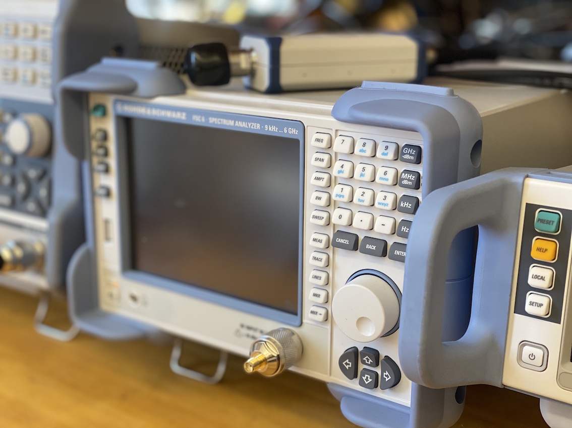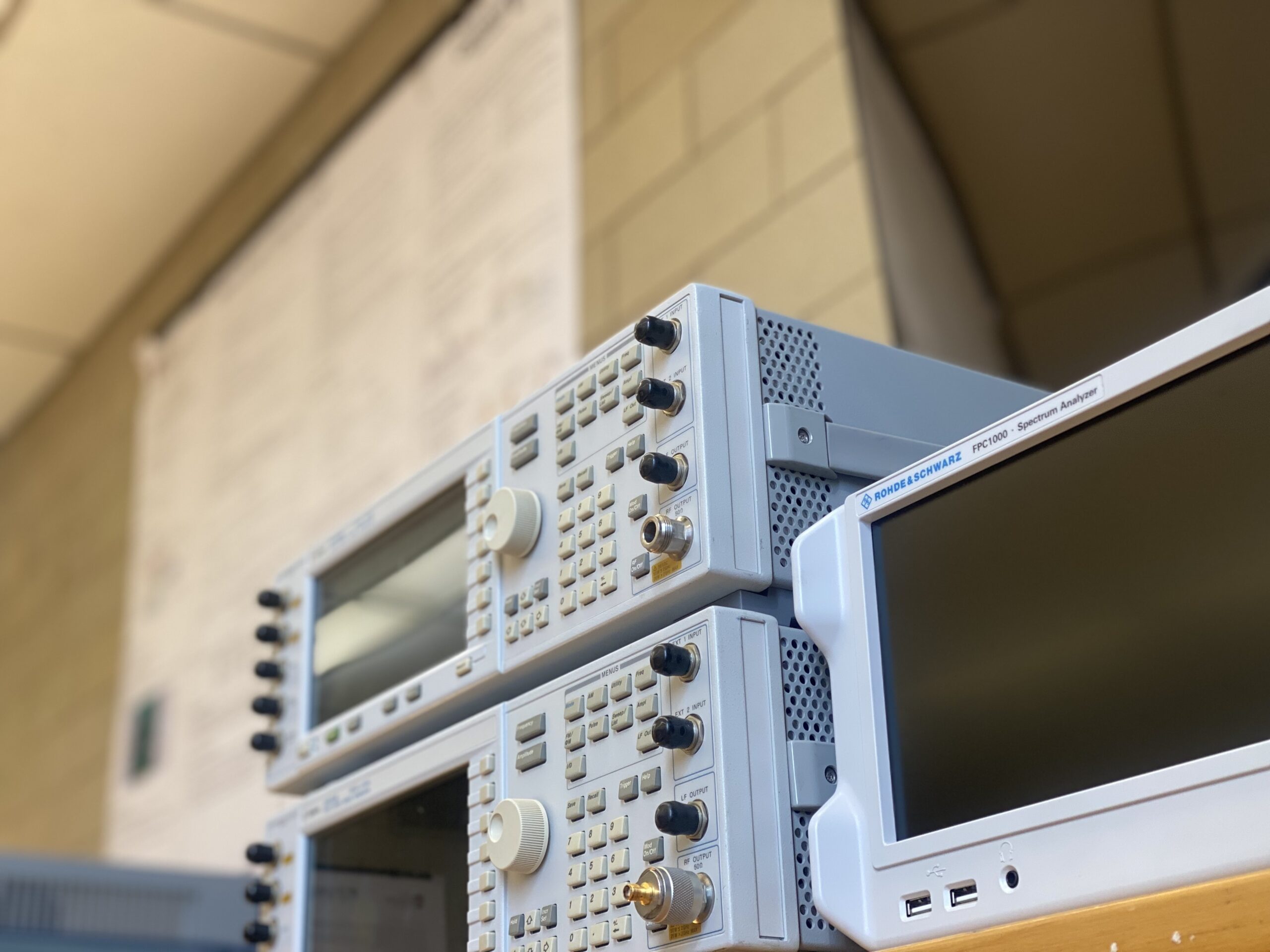 The lab is fully equipped with high-quality microwave test instruments capable of operation up to at least 6 GHz. Available tools include a Vector Network Analyzer (VNA) for S-parameter characterization, a Spectrum Analyzer (SpecA) for frequency-domain analysis, signal/frequency generators, power sensors, and precision attenuators. These instruments, enhanced through generous donations from Rohde & Schwarz (R&S), give students the ability to perform precise measurements of microwave components and antennas in a teaching-focused environment.