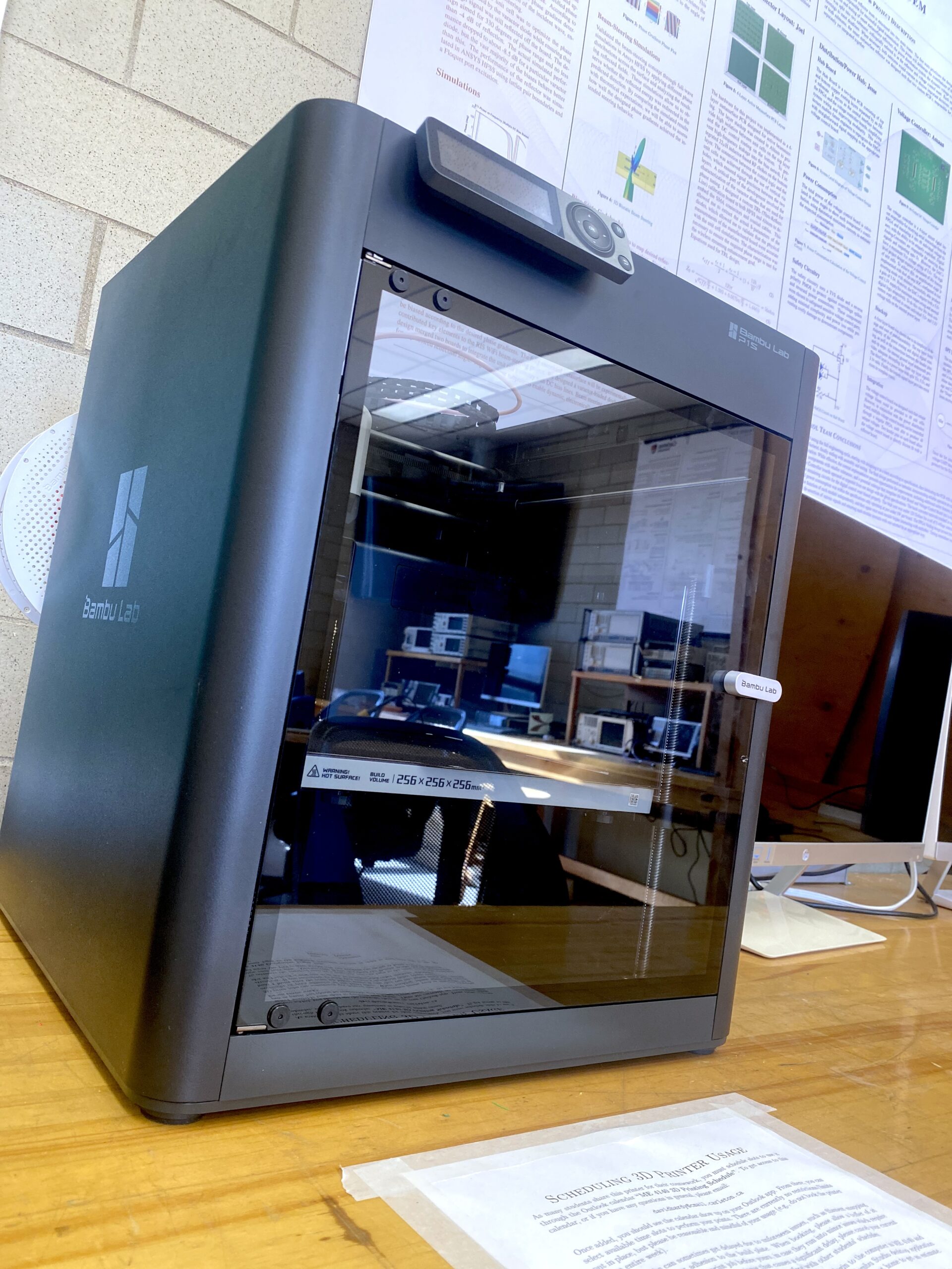 Beyond measurement equipment, the lab includes a high-end soldering station specifically designed for surface-mount technology (SMT) components, a hot plate for reflow soldering, and in-house 3D printing capabilities with Bambu Lab H2D printers. These tools allow students to rapidly fabricate custom antenna mounts, holders, fixtures, and prototype structures, while also enabling efficient assembly, repair, and testing of their own RF and microwave circuits — bridging the gap between simulation and real hardware in undergraduate projects.
