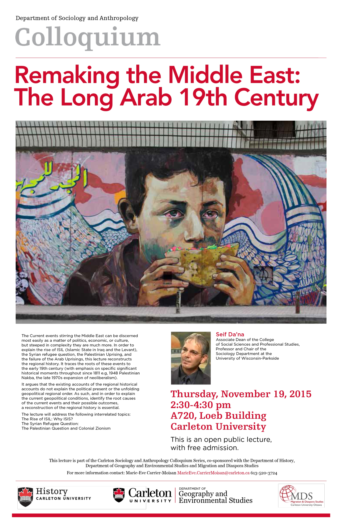 On November 19, 2015, Dr. Seif Da’na presented the Current events stirring the Middle East which can be discerned most easily as a matter of politics, economic, or culture, but steeped in complexity they are much more. In order to explain the rise of ISIL (Islamic State in Iraq and the Levant), the Syrian refugee question, the Palestinian Uprising, and the failure of the Arab Uprisings, this lecture reconstructed the regional history. It traced the roots of these events to the early 19th century (with emphasis on specific significant historical moments throughout since 1811 e.g, 1948 Palestinian Nakba, the late 1970s expansion of neoliberalism). Da’na argued that the existing accounts of the regional historical accounts do not explain the political present or the unfolding geopolitical regional order. As such, and in order to explain the current geopolitical conditions, identify the root causes of the current events and their possible outcomes, a reconstruction of the regional history is essential.
