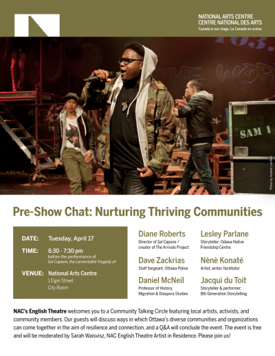 On Tuesday April 17th, I had the great honour of bringing together 6 extraordinary panelists for a Community Talking Circle on the theme of “Nurturing Thriving Communities.” This Talking Circle preceded that evening’s performance of Sal Capone, the Lamentable Tragedy of, by Omari Newton, and it was part of the Pre-Show-Chat series.