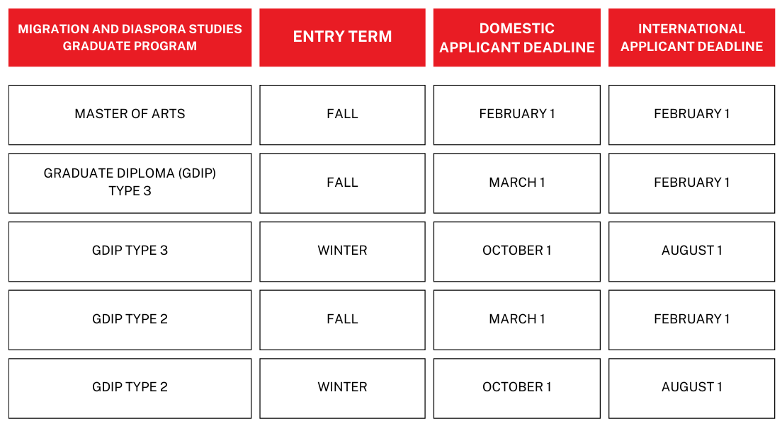 *Please note that participation in a graduate pathway does not guarantee your admission into the graduate program, but if you are admitted, your advanced standing will reduce your credit load in graduate studies and may shorten your time to completion. If you are interested, please consult both with your undergraduate advisor and the Migration and Diaspora Studies Program Director, ideally before you commence your third year of studies.