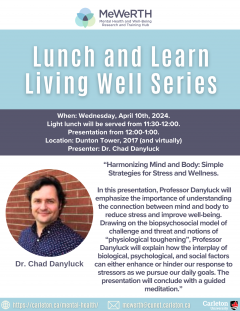 MeWeRTH will host a hybrid Lunch and Learn Living Well presentation on Wednesday, April 10th from 12:00-1:00 by Dr. Chad Danyluck, entitled . The presentation will be held in Dunton Tower, 2017 (and virtually). Light lunch will be served from 11:30-12:00.