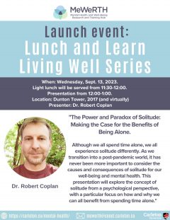 MeWeRTH hosted a hybrid inaugural Lunch and Learn Living Well Series on Wednesday, Sept. 13th, 2023. The presentation was held in Dunton Tower, 2017 (and virtually). The next Lunch and Learn will be held in November.