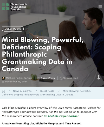“Mind Blowing, Powerful, Deficient: Scoping Philanthropic Grantmaking Data in Canada,” by Anna Hamilton, Jing Jia, Michelle Murphy and Tara Russell, was researched and written in collaboration with Philanthropic Foundations Canada (PFC). The research looks at the challenges in accessing and interpreting philanthropic grantmaking data in Canada, and builds on some of the work that PFC did in the 2024 Landscape Report. The report found two main data challenges in the Canadian nonprofit sector: (1) poor data quality, including filing errors and inability to categorize funding destinations on T3010 tax forms; and (2) data gaps at Statistics Canada, partly because of its notable lack of focus on the charitable sector over the decades. The Capstone report received ANSER’s 2025 Master’s Thesis/Capstone Project Award.