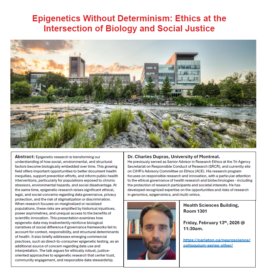 This Friday’s talk entitled, “Epigenetics Without Determinism: Ethics at the Intersection of Biology and Social Justice” will be delivered by Dr. Charles Dupras from the University of Montreal.