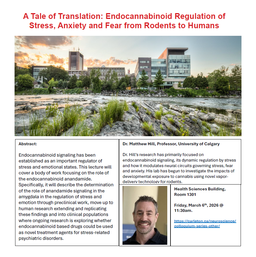 This week’s talk, “A Tale of Translation: Endocannabinoid Regulation of Stress, Anxiety and Fear from Rodents to Humans”, will be presented by Dr. Matthew Hill of the Hotchkiss Brain Institute at the University of Calgary.