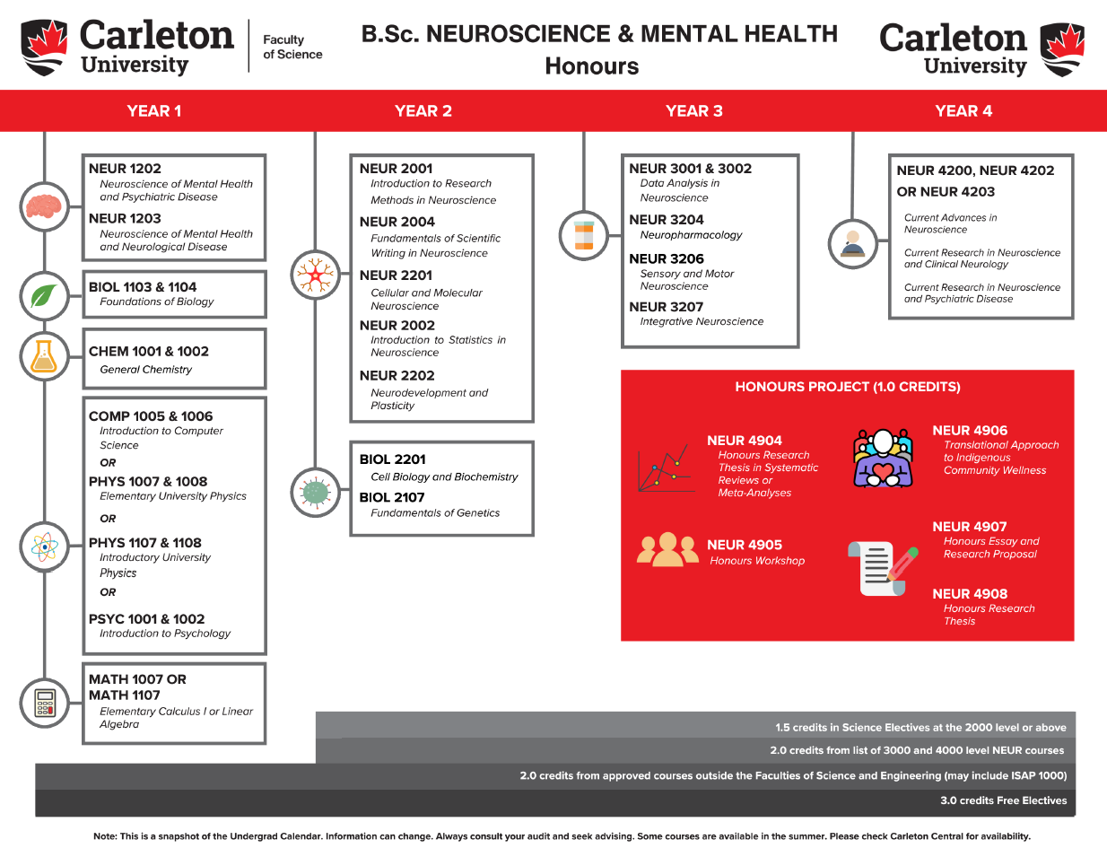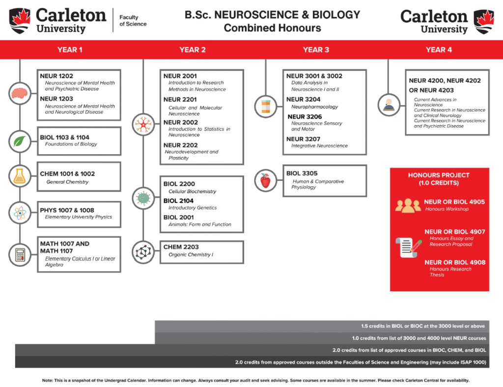 The following maps are intended to give an overview of what completing a Carleton Neuroscience honours program might look like. They are based on Fall 2025 program regulations, and are therefore not a definitive outline. Current students must consult their academic audit and program advisor for more precise guidance.