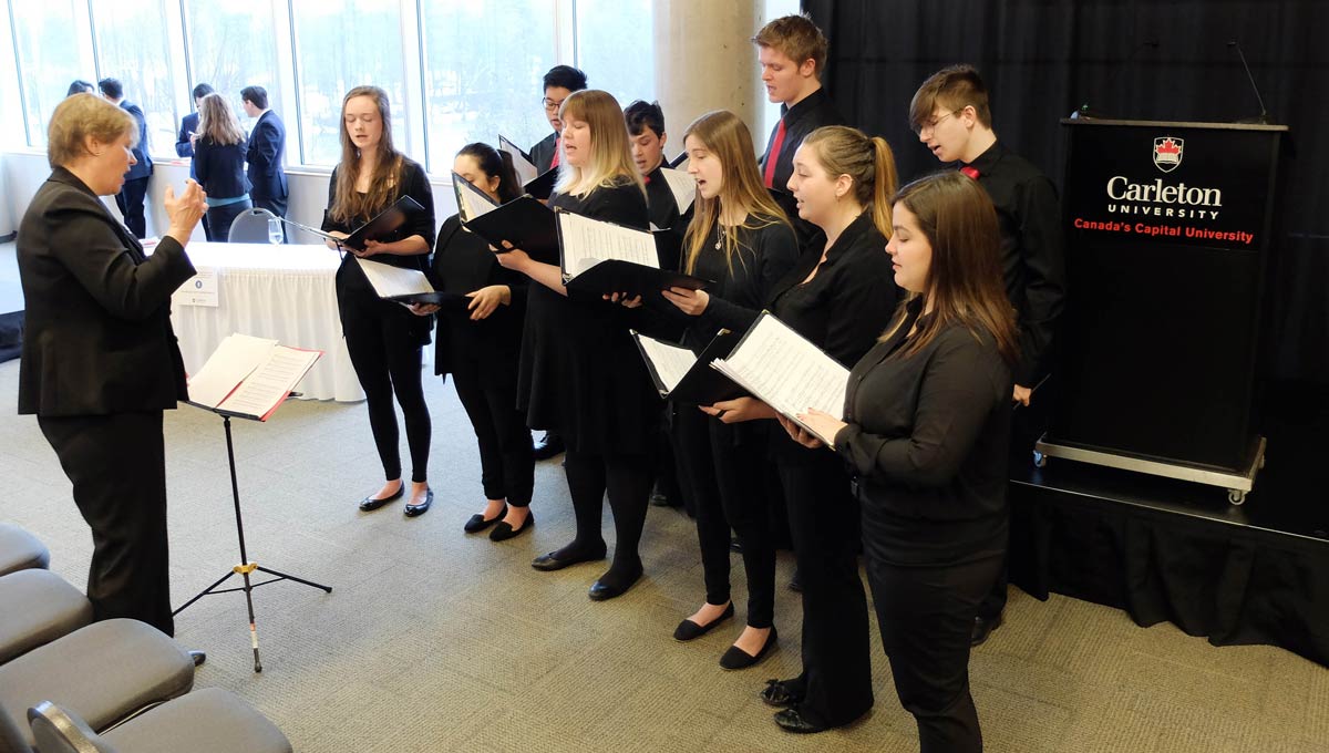 Springate invited the 40 candidates for Canadian citizenship to stand and recite the Oath of Citizenship. The new citizens accepted their certificates, signed their oaths and received mini Canadian flags to commemorate the special event. The Carleton Chamber Singers led the room in an acapella rendition of O Canada.