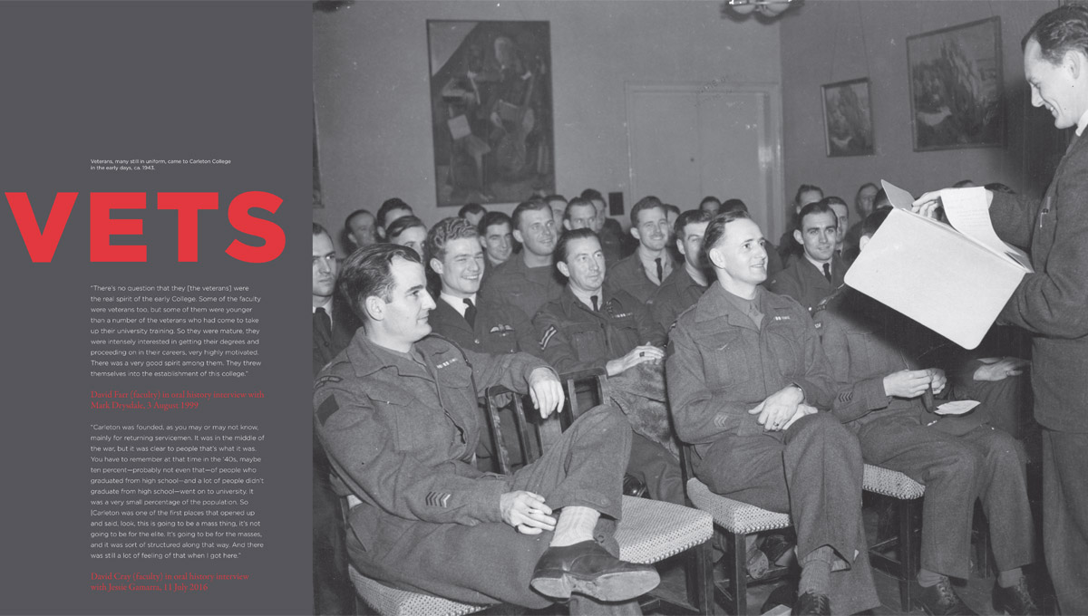 It brings together not only key pieces of the university’s historical narrative, such as the construction of new buildings and Carleton’s connection to Canada’s war vets, but also smaller, lesser known (and less laudatory stories), like the time a group of students who wanted a Christmas tree cut down a rare fir across the canal at the Dominion Arboretum.