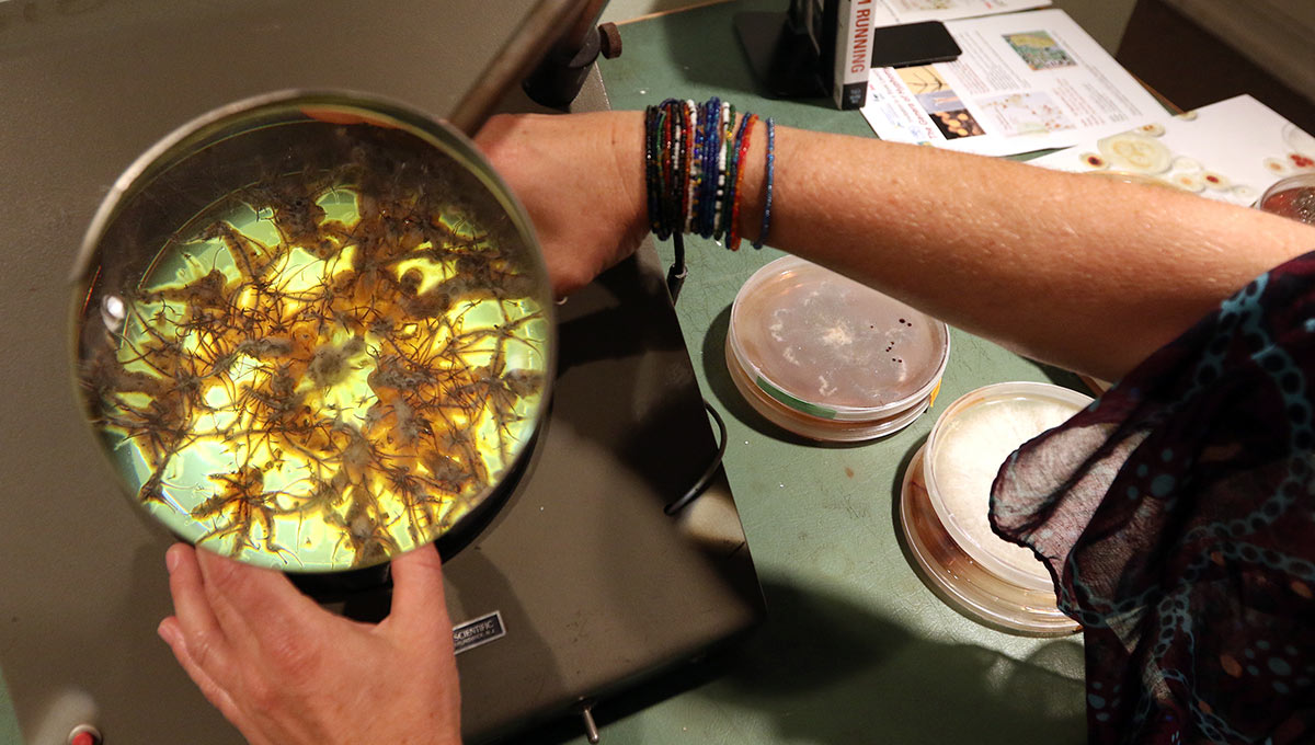 No, there’s no humidity problem at the gallery. The live specimens of mushroom mycelium are part of “La chambre des cultures, foraging in time and space,” a collaboration between Gatineau artist Annie Thibault and Carleton Biology Prof. Myron Smith.