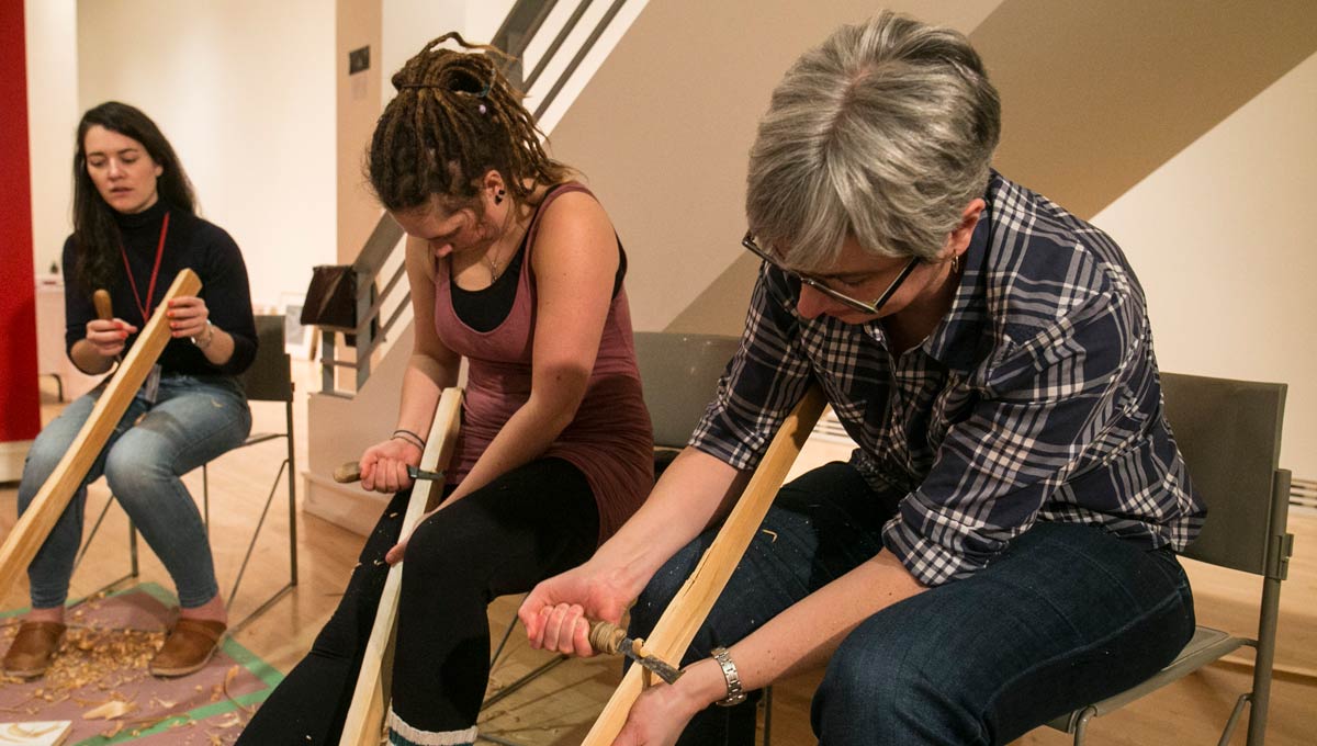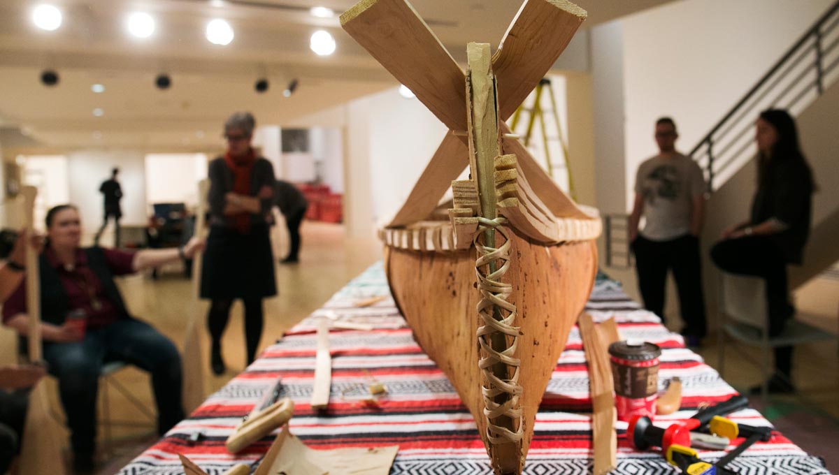 In collaboration with the university’s Centre for Aboriginal Culture and Education (CACE), the Carleton University Art Gallery (CUAG) hosted weekly gatherings where students, including myself, were introduced to customary Anishinaabe tools, materials and methods in canoe making.