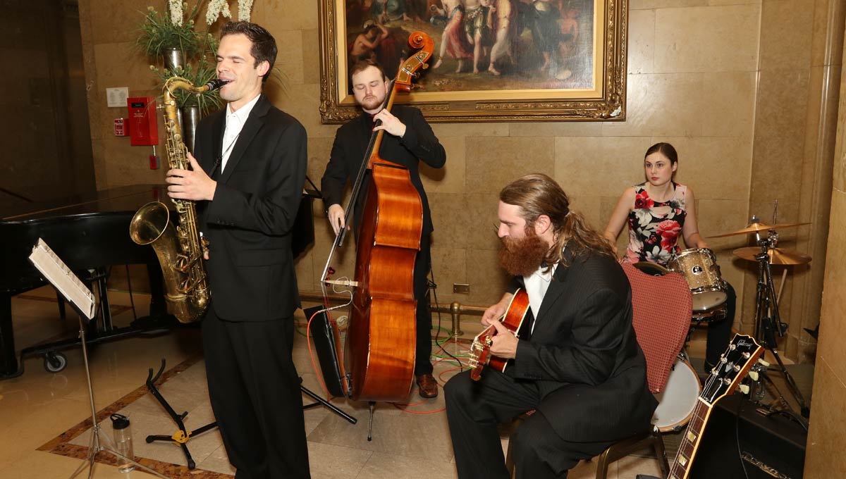 They were welcomed by a jazz quartet performing vintage 1940s music and a flash mob performance of Boogie Woogie Bugle Boy before being led into the Drawing Room by bagpiper Jack Coghill, a Carleton music instructor and alumnus.