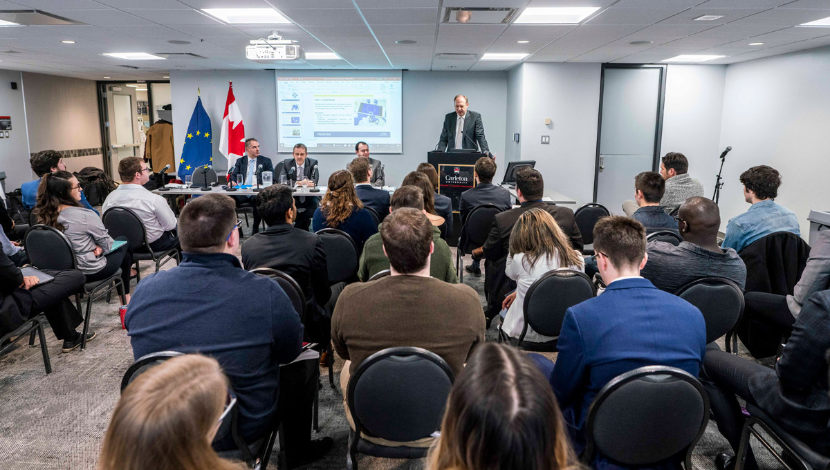 On March 11, Carleton University undergraduate students in Political Science participated in a simulation of the third meeting of the EU-Canada Joint Ministerial Committee. They discussed progress of the Strategic Partnership Agreement signed in October 2016. The experiential learning exercise organized by Prof. Mukhtar Hajizada enabled students to apply their skills in a quasi-diplomatic environment. They took on the roles of meeting participants, including representatives from federal and provincial governments, the European Commission and the diplomatic community. By conveying the positions of consumers, industry representatives and other key stakeholders, students were able to deeply understand the positions of the various actors.