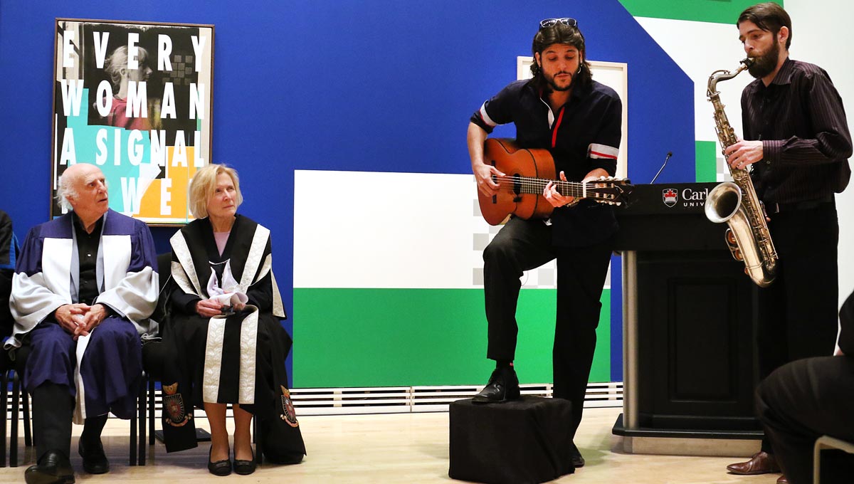 Vigneault was welcomed to Carleton by fourth-year Music student Rommel Ribeiro, who will commence a master’s program shortly at the Berklee College of Music in Valencia, Spain. Ribeiro performed Vigneault’s 1976 song J’ai planté un chêne (“I planted an oak tree”) on guitar while accompanied by saxophone performer Steve Patterson.