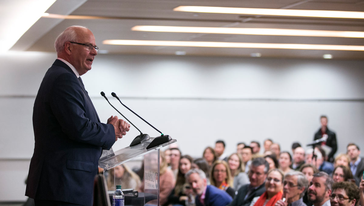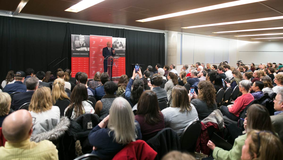 In his speech, Peter Mansbridge acknowledged that journalism faces numerous challenges: reduced budgets, increased devices and the need to reflect diverse demographics – all balanced against spin doctors and politicians who are more adept than ever at crafting messages of their own.