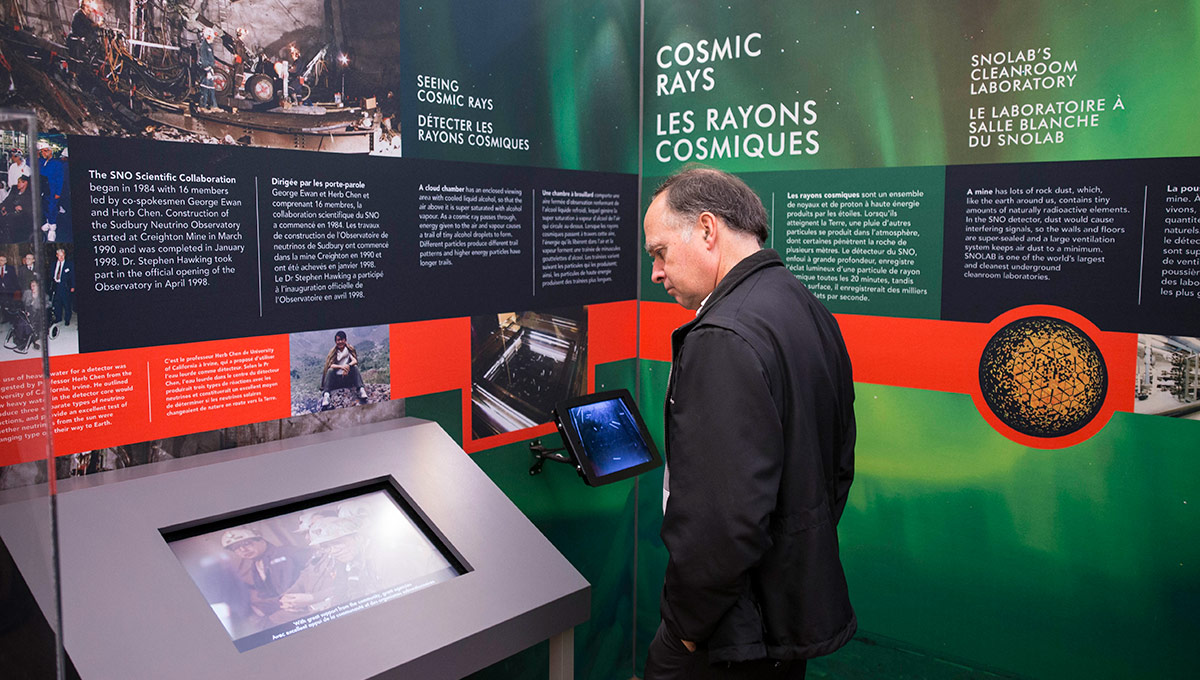 The 800-square-foot exhibit, produced by Sudbury’s Science North with input from SNO and SNOLAB researchers, features 40 panels with spectacular images documenting the history and development of SNO and SNOLAB, interactive video kiosks, a virtual tour of SNOLAB and its experiments, and the stories of the people behind the science.