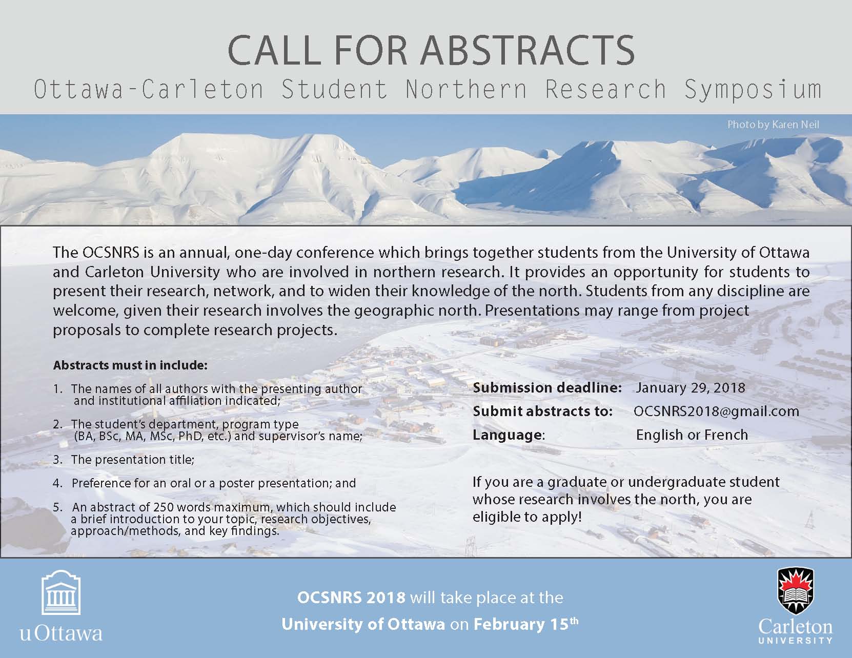 Any graduate or undergraduate student at the University of Ottawa or Carleton University whose research involves the north is welcome to present or attend. Students from any discipline are encouraged to participate, as long as their research involves the geographic north. Posters and presentations may be in English or French.
