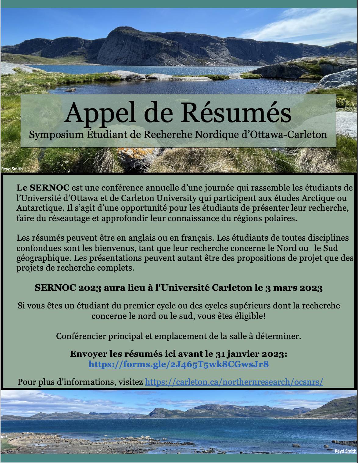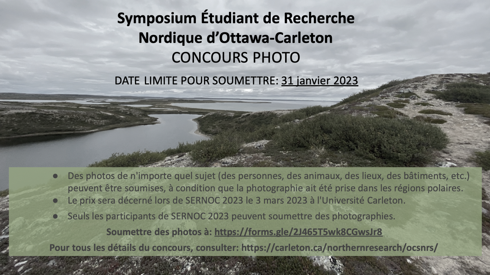 Le Symposium Étudiant de Recherche Nordique d’Ottawa-Carleton (SERNOC) est une conférence annuelle d’une journée qui aura lieu le 3 mars 2023. Il donnera l’occasion aux étudiants de l’Université Carleton et de l’Université d’Ottawa de se rencontrer, de présenter leurs recherches, et d’apprendre les uns des autres. Cette année, l’SERNOC aura lieu à l’Université Carleton.