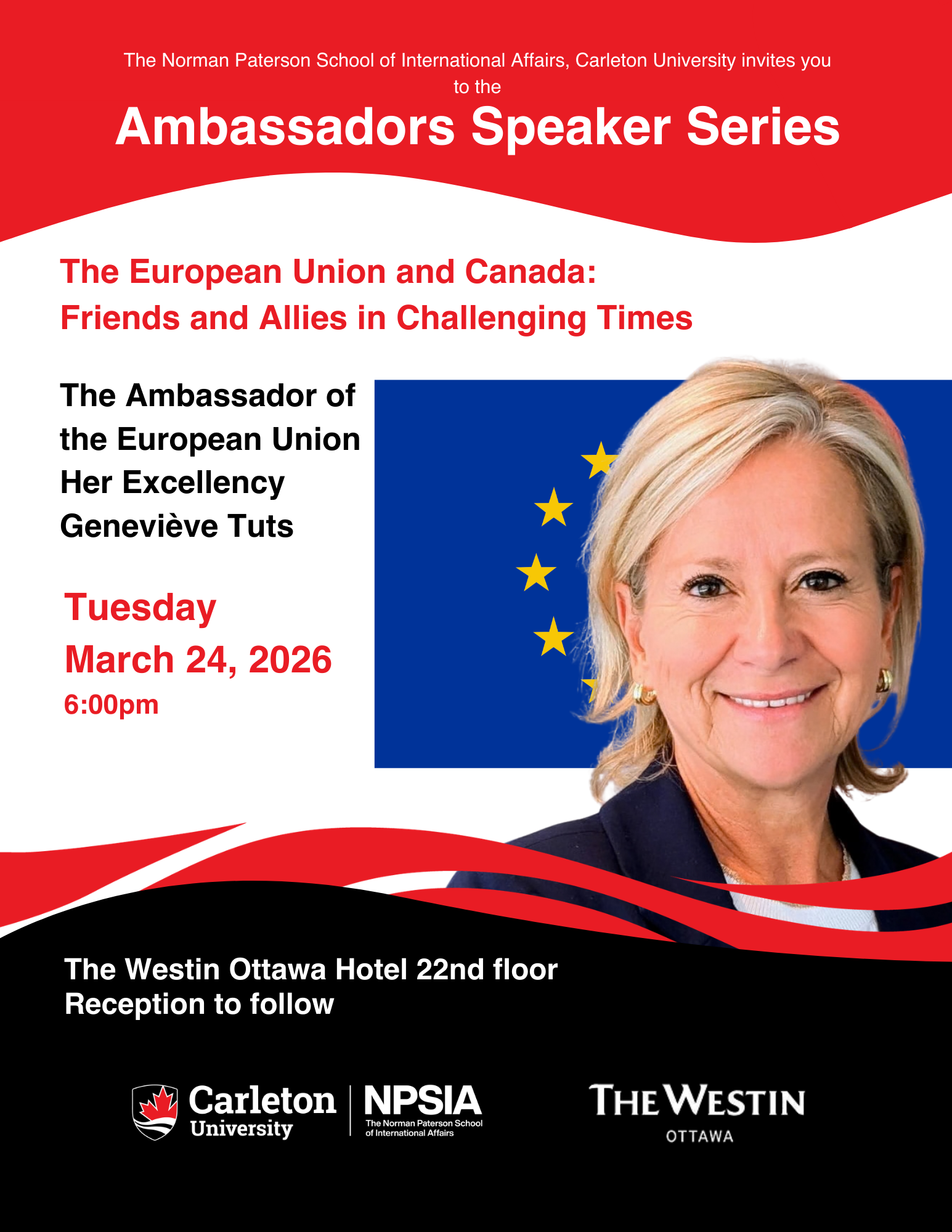 The Norman Paterson School of International Affairs at Carleton University invites you to the last of our Ambassadors Speaker Series for the 2025-2026 season, featuring the The Ambassador of the European Union, Her Excellency Geneviève Tuts with the topic: “The European Union and Canada: Friends and Allies in Challenging Times“