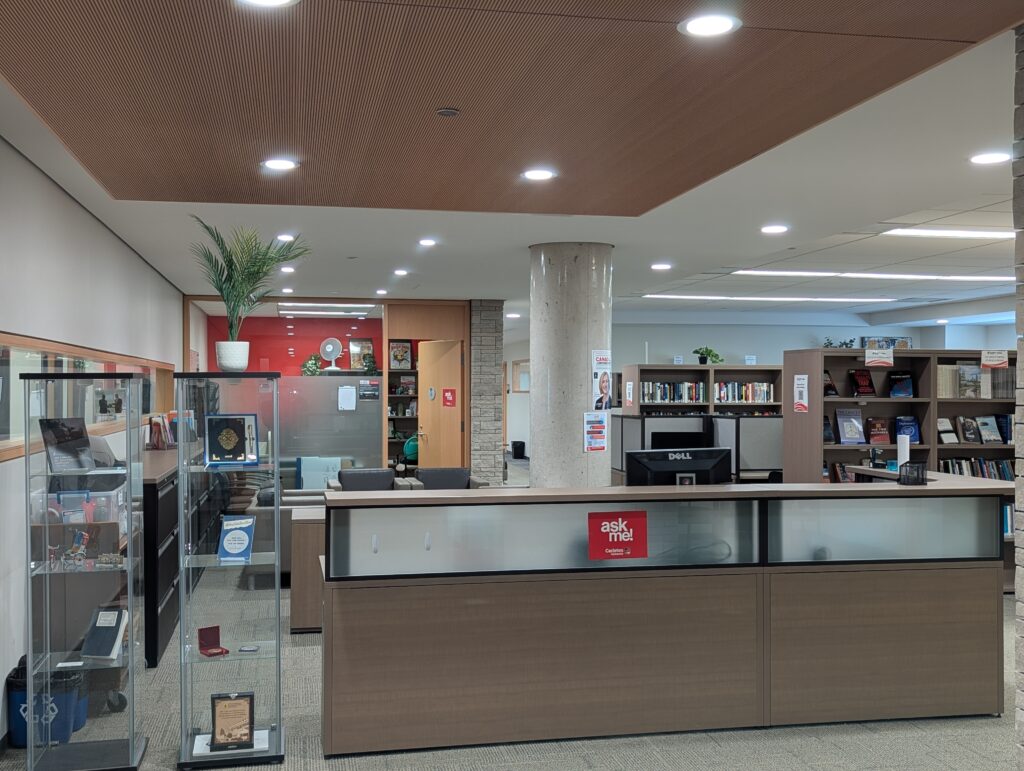 We have a number of resource materials that can be checked out, as well as computers available for students to use. There are plenty of outlets throughout the centre to plug in laptops and other devices.