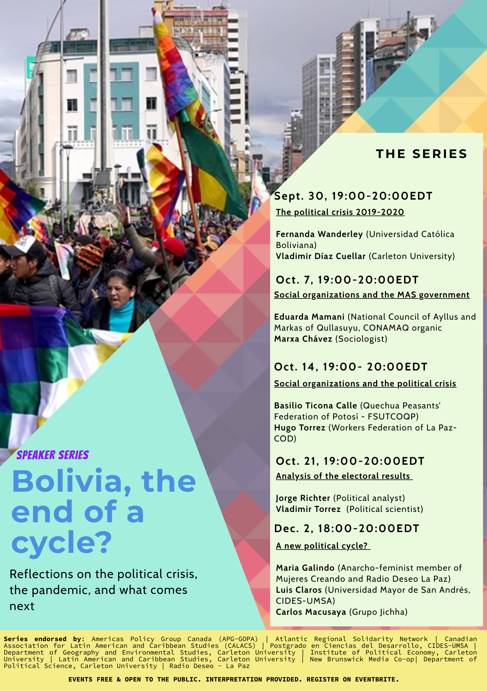 Americas Policy Group Canada (APG-GOPA) | Atlantic Regional Solidarity Network | Canadian Association for Latin American and Caribbean Studies (CALACS) | Centre for Research on Latin America and the Caribbean (CERLAC) | Department of Geography and Environmental Studies, Carleton University | Department of Political Science, Carleton University | Institute of Political Economy, Carleton University | Latin American and Caribbean Studies, Carleton University | New Brunswick Media Co-op| Postgrado en Ciencias del Desarrollo, CIDES-UMSA | Radio Deseo – La Paz