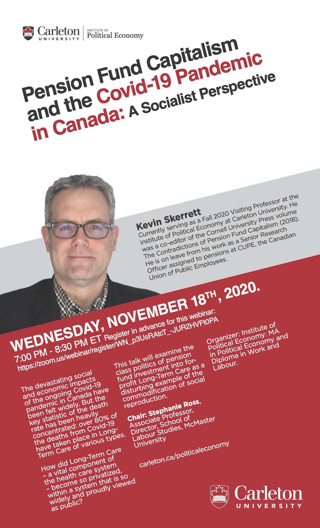 All are invited to attend the Institute of Political Economy’s Visiting Professor Lecture by Kevin Skerrett, “Pension Fund Capitalism and the Covid-19 Pandemic in Canada: A Socialist Perspective.”