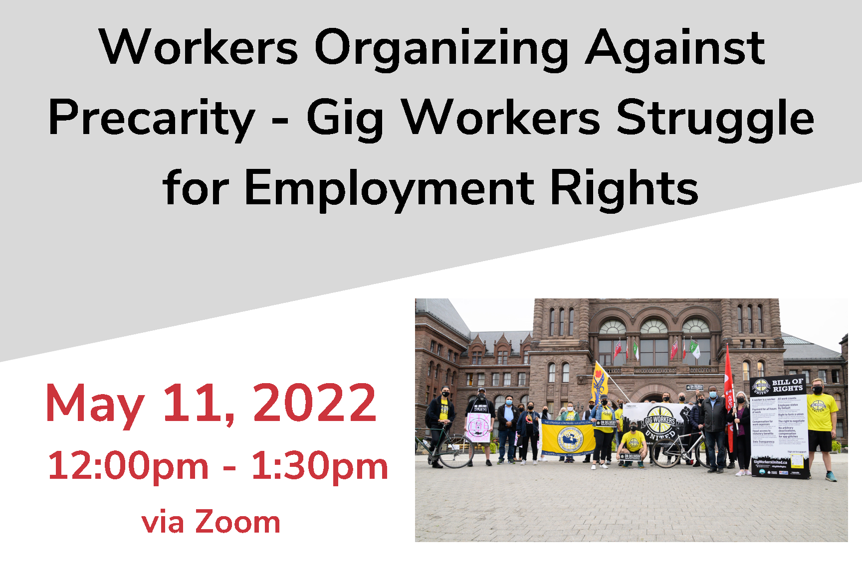 Panellists will review and evaluate the ongoing organizing efforts in Ontario to gain employment rights, how the Ford government is threatening those rights and what we can do to support the Gig Workers Bill of Rights.