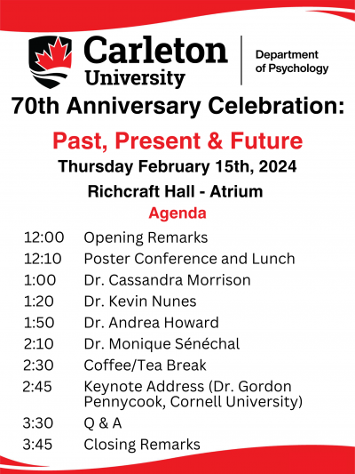 The Psychology Department invites you to join us in celebrating our 70th anniversary! This event will feature a lunch and graduate student poster session, talks by some of our own faculty members (Cassandra Morrison, Kevin Nunes, Andrea Howard, Monique Sénéchal) and an external speaker (Gordon Pennycook, Cornell University)!