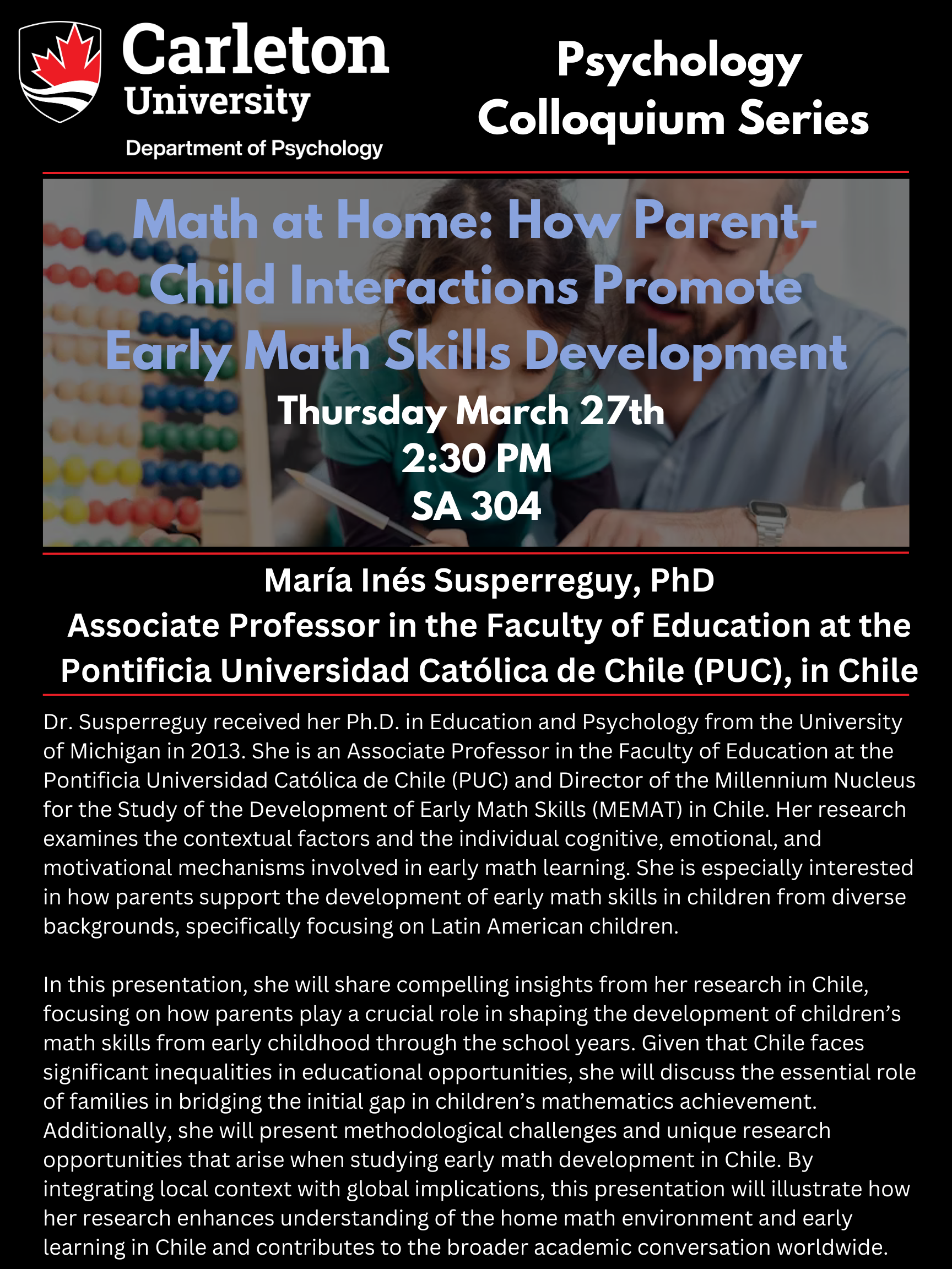 As a part of the Psychology Colloquium Series, Dr. María Inés Susperreguy will be presenting on “Math at Home: How Parent-Child Interactions Promote Early Math Skills Development”. Join us in SA 304 on Thursday March 27th at 2:30 PM!