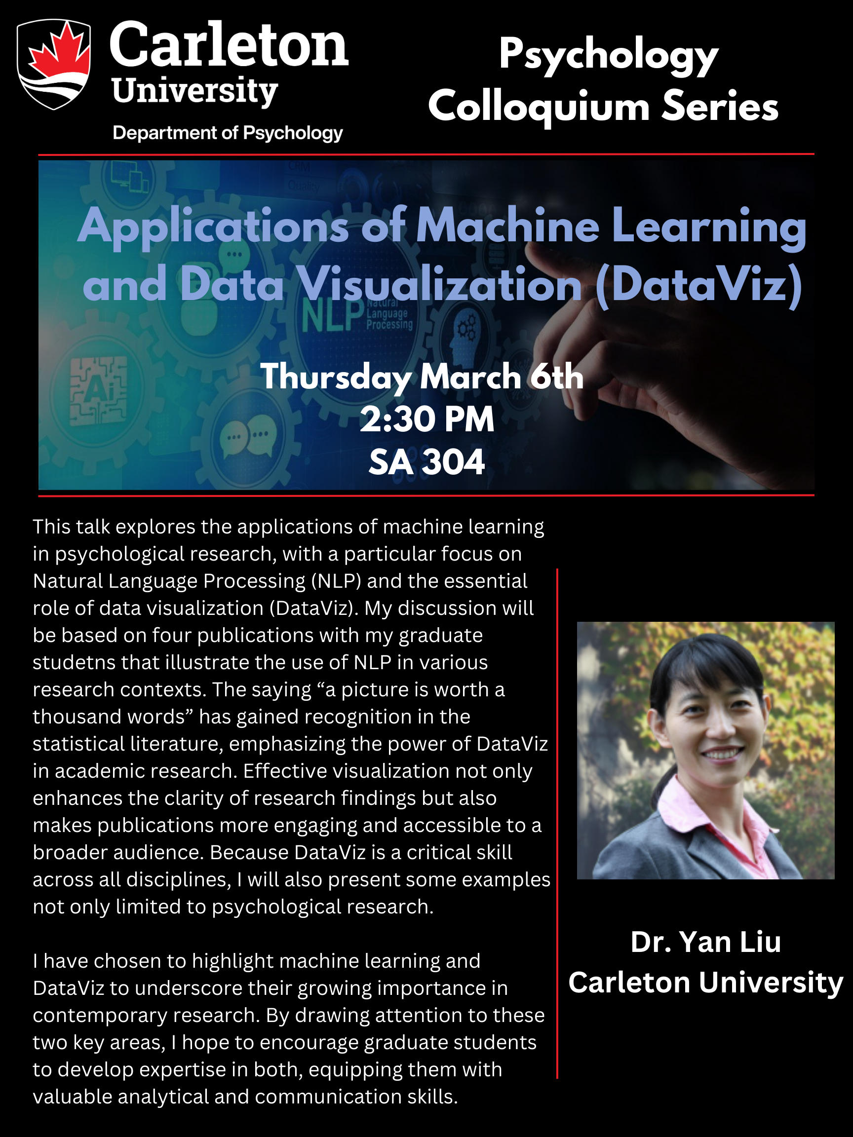As a part of the Psychology Colloquium Series, Dr. Yan Liu will be presenting on “Applications of Machine Learning and Data Visualization (DataViz)”. Join us in SA 304 on Thursday March 6th at 2:30 PM!