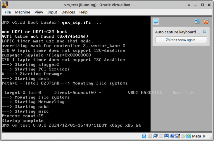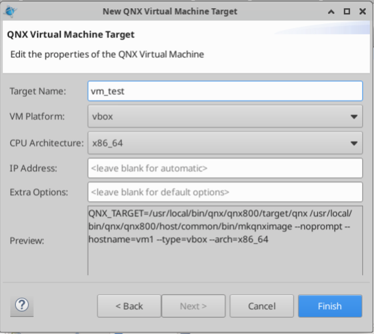 To develop software for QNX, there should be a host VM for development, and a target machine with the QNX OS to test and deploy your software. A straightforward way for a target machine is a QNX Virtual Machine. In this section we go over the configuration required to create a QNX target VM using VirtualBox.