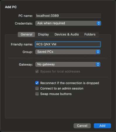 In the new opened dialog, fill up the PC name with “localhost:3389”. For credentials, you can set it up or fill it in when required, using your username and password provided by RCS.