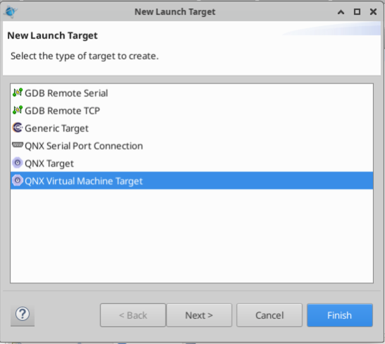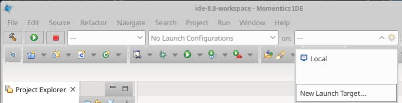 You will first need to create a target (QNX VM). To create a target, click the dropdown menu besides “on:” and click “New Launch Target…”.