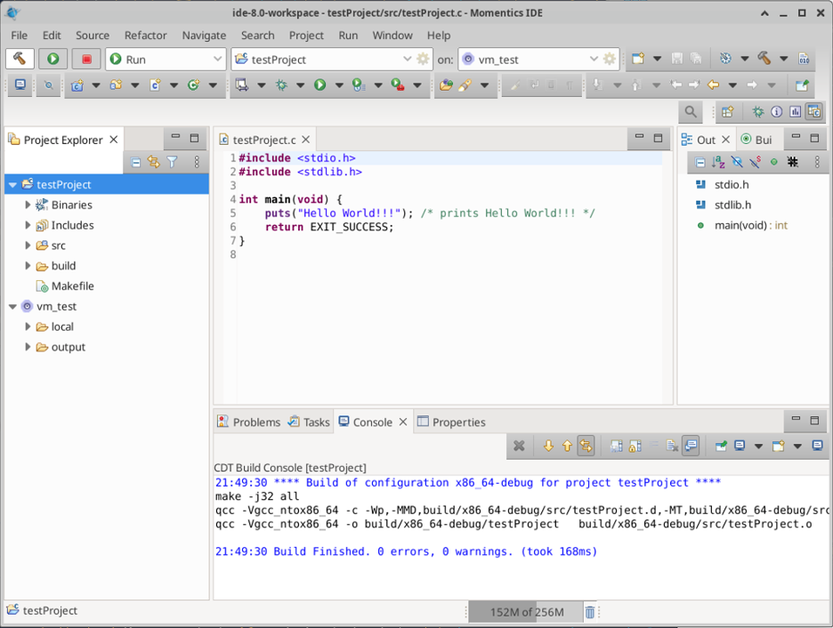 If everything went well and QNX Momentics was able to find the IP address of the QNX VM then you are ready to create your first project. It is possible to verify this by looking at the icon of the QNX VM (vm_test). The figure below shows a correctly configured VM.