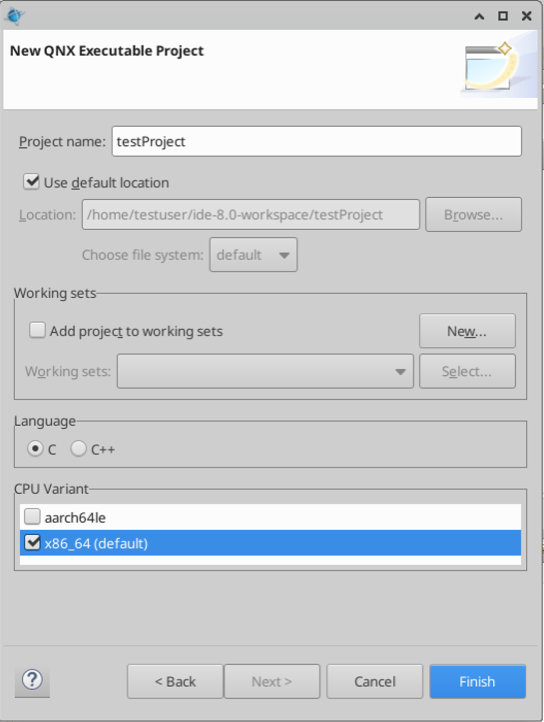 To create a simple project, click on the menu File > New > QNX Project, then select QNX Executable and click next. Create a project a name and select the CPU Variant as x86_64.