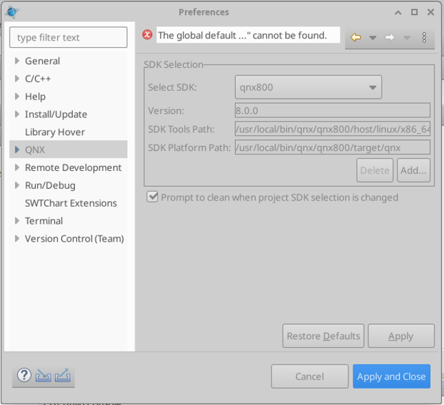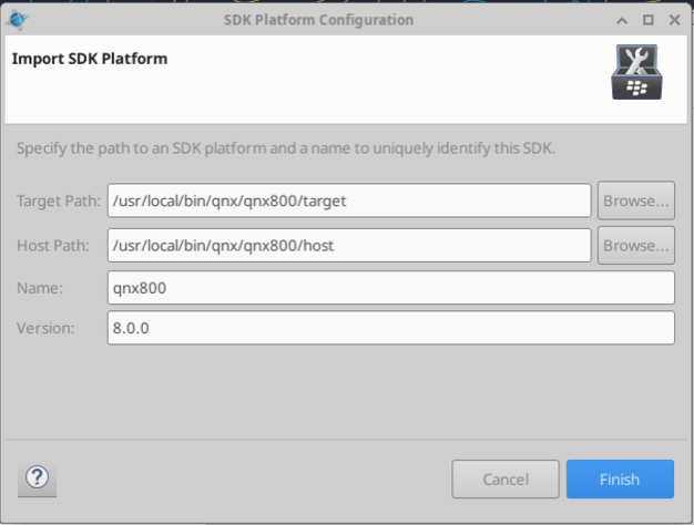 In the SDK selection, click “Add…”, then “Browse”. In the newly open dialog, navigate to the default path where the SDK is installed (/usr/local/bin/qnx/qnx800) and select that path. Finally, click “Finish”.