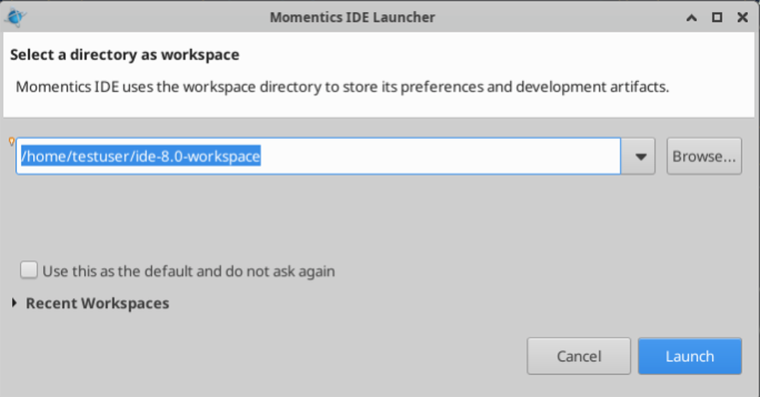 Open the QNX Momentics IDE, and select the workspace location, then click “Launch”. Note that the default location is in a folder inside your home directory.