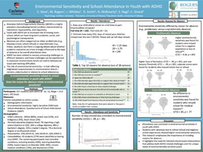 Hare, C., Rogers, M. A., Whitley, J., Smith, D., McBrearty, N., Nagi, S., & Girard, C. (2025, June). Environmental sensitivity and school attendance in youth with ADHD. Poster presented at the International Society for Research in Child and Adolescent Psychopathology. Vancouver, BC.