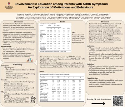 Aubry, D., Rogers, M.A., Carwana, C., Jiang, Y., Climie, E.A., Mah, J. W. T. (2025, October). Involvement in education among parents with ADHD symptoms: An exploration of motivations and behaviours. Presented at the Canadian ADHD Resource Alliance (CADDRA) Annual ADHD Research Day, Vancouver, BC.