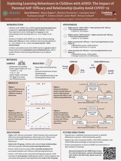 Hewson, Z., Rogers, M.A., Parvanova, M., Hare, C., Jiang, Y., Climie, E.A., Mah, J. W. T. (2025, October). Examining learning behaviours in children with ADHD: The impact of parental self-efficacy and relationship quality amid COVID-19. Poster presented at the Canadian ADHD Resource Alliance (CADDRA) Annual ADHD Research Day, Vancouver, BC.