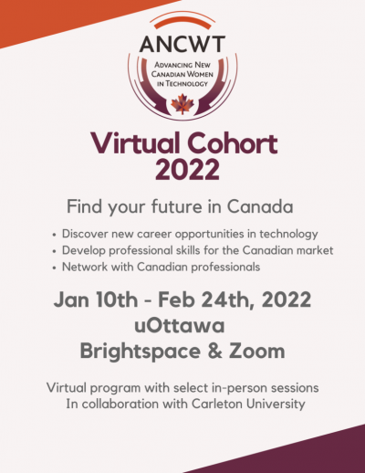 The 2022 edition is supported by the Shared Online Projects Initiative (SOPI) and is facilitated by Profs. Leila Mostaço-Guidolin, Cristina Ruiz-Martín (Carleton University) & Prof. Sawsan Abdul-Majid (University of Ottawa). ANCWT is a program designed to facilitate bridging international women students and professionals in STEM to the Canadian job market. More information about ANCWT can be found here.