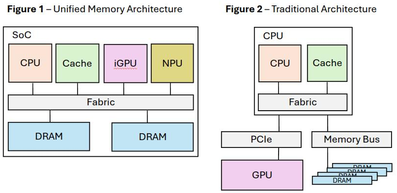Computers with unified memory architecture feature a single shared pool of memory used by both the CPU and GPU, unlike traditional systems that have separate RAM and VRAM (see figure 1 & 2). This unified design, popularised by Apple’s M series chips, enables higher efficiency, reduced latency, and faster data transfer since the CPU and GPU work with the same memory space therefore don’t need to travel using the overhead of the bus.