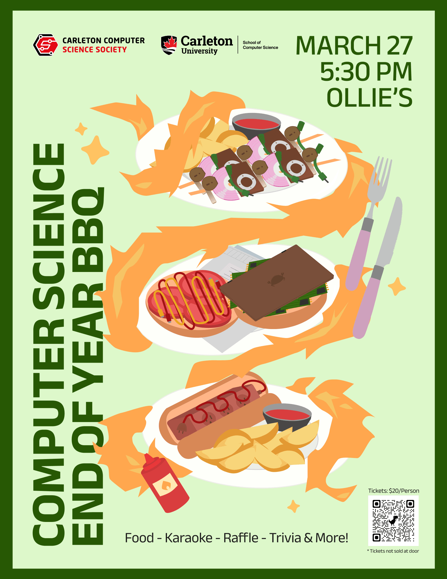 The School of Computer Science (SCS) and Carleton Computer Science Society (CCSS) welcome ALL students, faculty, retired faculty, staff & CS alums in Computer Science, Data Science, Cybersecurity, HCI, Data Science Specialization, and DSSAI to our annual end-of-year BBQ on Friday, March 27th, at 5:30 p.m.
