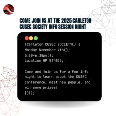 Hey Ravens! We’re ecstatic to announce that the Carleton CUSEC Society is hosting an information session for the Canadian University Software Engineering Conference (CUSEC). If you’re looking to land an internship, participate in engaging workshops, and mingle with your peers, CUSEC might just be for you! Join us on November 4th in HP 5345 to learn more about CUSEC.