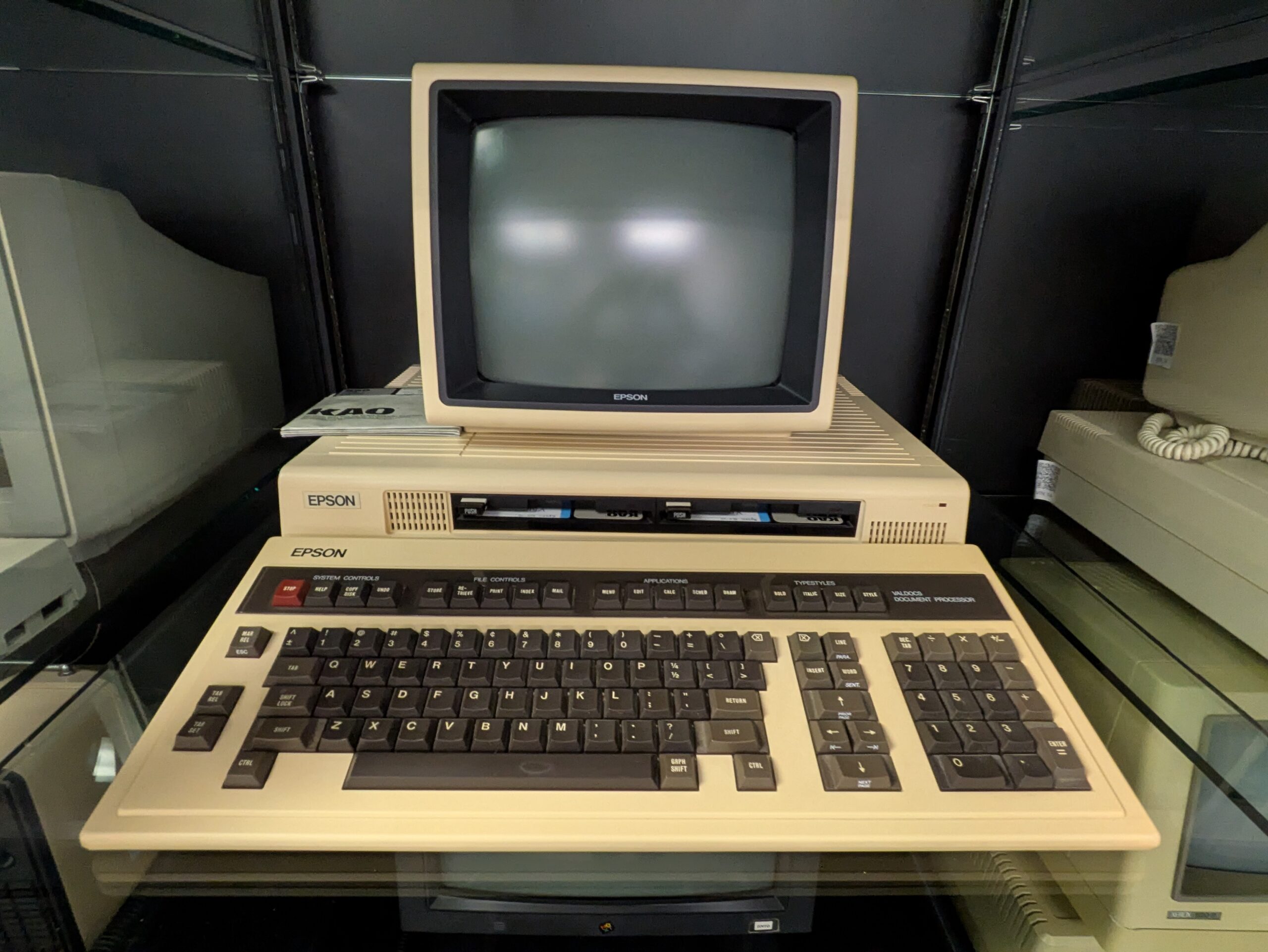 The Epson QX-10, introduced in 1983, was notable for running CP/M or the enhanced TPM-III operating system on a Zilog Z80 processor with up to 256 KB of RAM and advanced graphics driven by a separate NEC graphics processor. Its claim to fame lies in its bundled office suite, Valdocs, which was among the first to offer a WYSIWYG word processor integrated with spreadsheets and other productivity tools, catering specifically to business users and making it a pioneering “appliance” computer with user-friendly software. It had moderate popularity, especially in North America, but was limited by performance issues and the rise of IBM PC compatibles, making it significant in computing history as an early attempt at graphical office environments and robust business-oriented microcomputers without proprietary chips, valuable for vintage computing museums in illustrating early graphical microcomputing and software innovation.