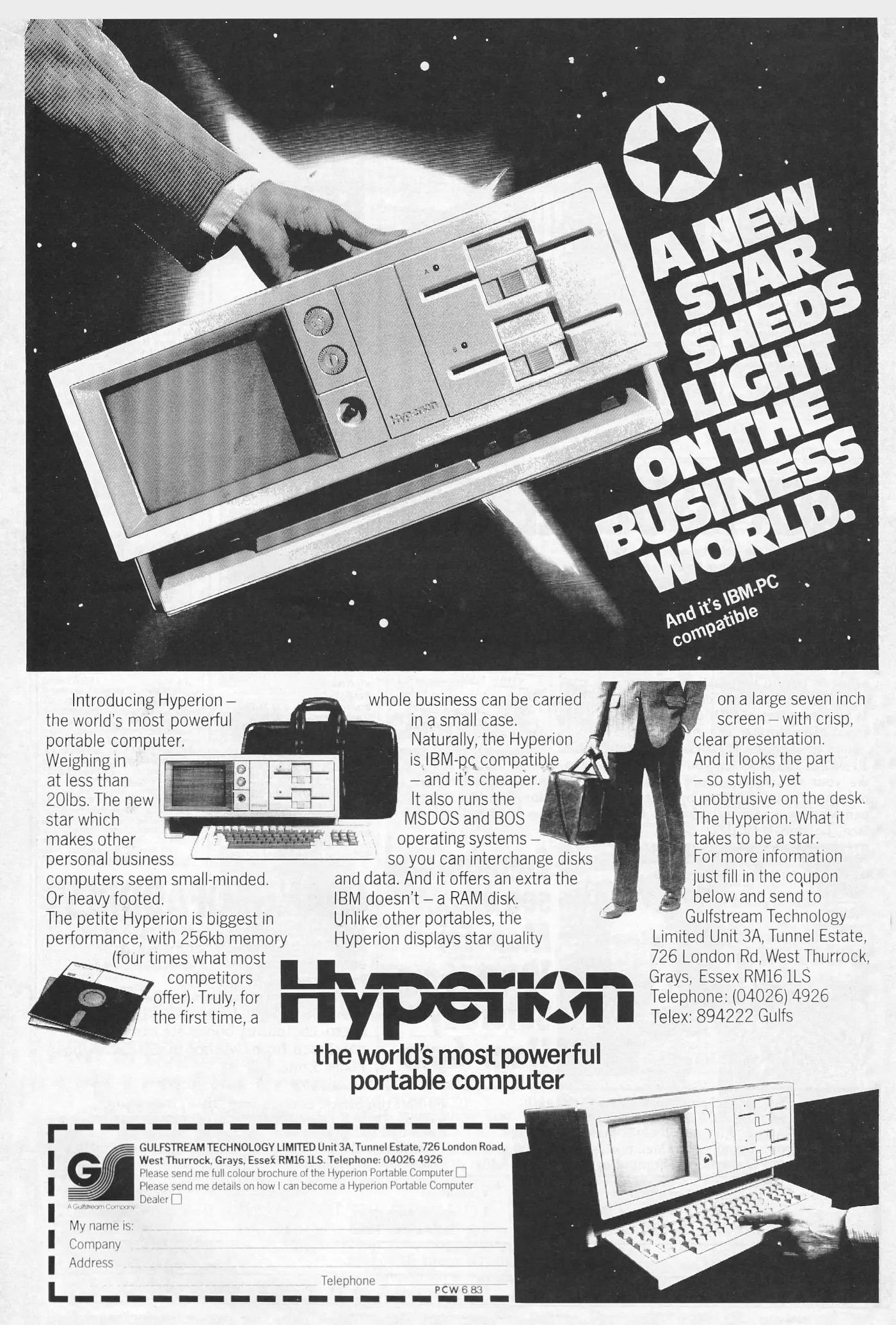 The Bytec Hyperion beat the Compaq Portable to become the first IBM PC-compatible portable, but was less compatible with IBM software due to hardware differences. A pioneering early portable (or “luggable”) IBM PC-compatible computer, introduced in 1983 by Dynalogic Corporation of Ottawa, later acquired by Bytec Management Corp. Its most notable features included a compact and lightweight (LoL) design (about 18–21 pounds), a built-in 7-inch amber CRT display, dual 5.25″ floppy drives, and an innovative menu-driven interface using function keys for ease of use. The Hyperion’s claim to fame was being the first IBM PC-compatible portable computer to reach the market, narrowly beating the Compaq Portable by a couple of months, and showcasing Canadian innovation in the rapidly growing personal computing industry. Despite initial excitement and strong pre-orders, its imperfect IBM compatibility and reliability issues limited its long-term popularity.